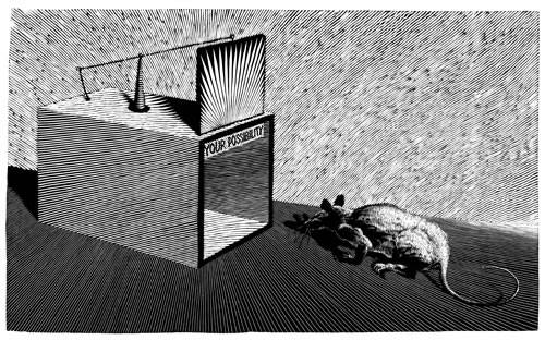 “It is right, but it’s not fair! Everything is cut out from linoleum. This is not just art, this is big art! Frankly speaking, it should be illegal to exhibit this kind of stuff publicly. There will be lot of pictures! You enter the room, you see pictures on your right, and on your left, and surprise surprise, in front there will also be one big picture!”