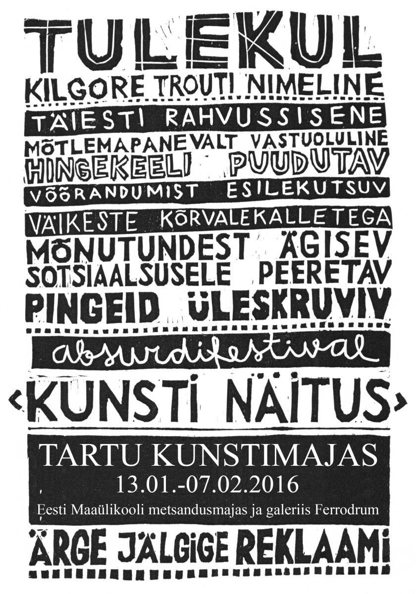 ▩ Exhibitions open from 13th of January till 7th of February.▩ SUUR FESTIVALI AVAMINE pühapäeval 17. jaanuar kell 17.00 Tartu Kunstimajas: