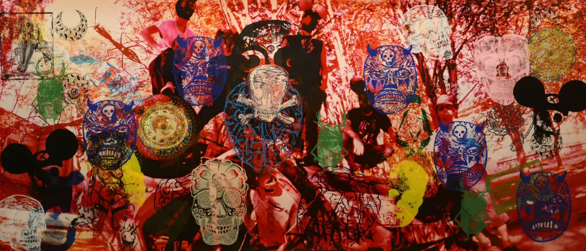 The work was completed during a tour in Asia, America, and Europe in 2010-2015. In each city, one of the global underground stars has left an imprint of their visual figurative language on the documentation of the performance art events, whether in front of the lens, in a woodcut, silkscreen, as a specific human resource, memory, or handprint – in New Orleans, Oklahoma, Corpus Christi, Beijing, Texas, Paris, Black Rock City, Nevada, Burning Man, Miami, the Faroe Islands, Iceland, Paris, Berlin, New York.