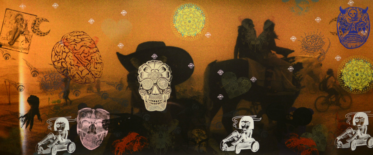 The work was completed during a tour in Asia, America, and Europe in 2010-2015. In each city, one of the global underground stars has left an imprint of their visual figurative language on the documentation of the performance art events, whether in front of the lens, in a woodcut, silkscreen, as a specific human resource, memory, or handprint – in New Orleans, Oklahoma, Corpus Christi, Beijing, Texas, Paris, Black Rock City, Nevada, Burning Man, Miami, the Faroe Islands, Iceland, Paris, Berlin, New York.