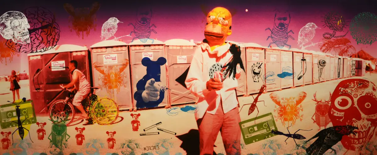 The work was completed during a tour in Asia, America, and Europe in 2010-2015. In each city, one of the global underground stars has left an imprint of their visual figurative language on the documentation of the performance art events, whether in front of the lens, in a woodcut, silkscreen, as a specific human resource, memory, or handprint – in New Orleans, Oklahoma, Corpus Christi, Beijing, Texas, Paris, Black Rock City, Nevada, Burning Man, Miami, the Faroe Islands, Iceland, Paris, Berlin, New York.